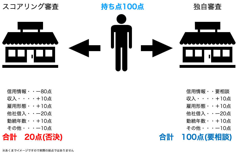 本来大手が採用するスコアリング審査では、持ち点100点としてそこから様々な減点がされていき、最終的に基準点を上回っていれば融資という形になります。
