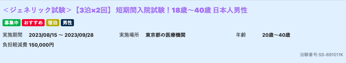上記の案件も報酬が15万円と高額なため、特に何もせずベッドの上でぼーっとしてるだけで報酬が貰えるので楽して稼ぐとはこのことかもしれません。