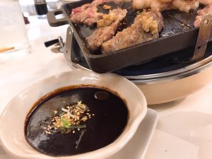 焼けたお肉をタレにたっぷりつけてまた焼きます。