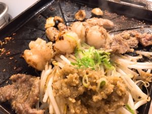 赤(中落)・マルチョウ(小腸)・アブタン(豚舌)・タンコリ(喉)・ツナギ(首)が一斉に鉄板で焼かれます。